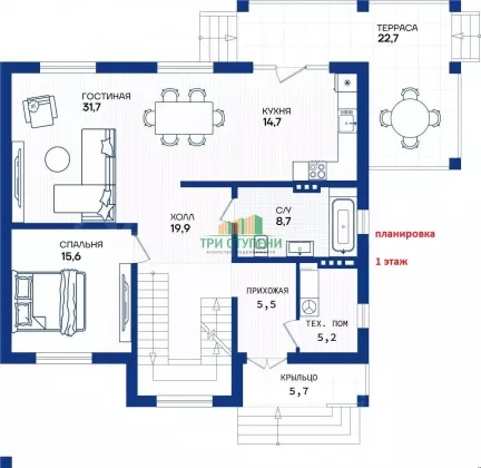Планировка: 1-й этаж: Прихожая. Холл, Кухня- Столовая- Гостиная с выходом на террасу (22,9 ), Спальня, С/у, тех. помещение.