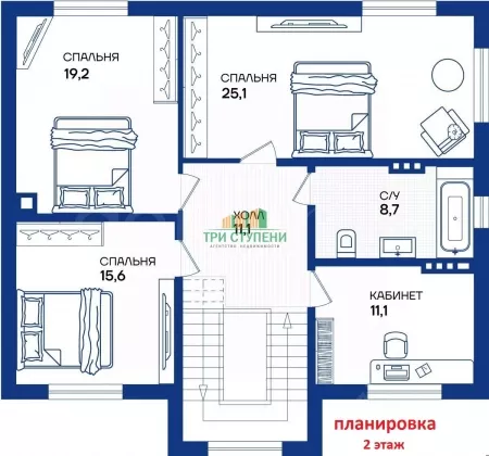 Планировка 2-й этаж: Три спальни, кабинет, с/у.